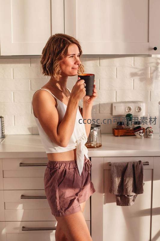 一位短发年轻女性身着白色系带上衣与紫褐色家居短裤,站在现代简约厨房中,手捧黑色陶瓷杯轻啜饮品,侧脸带笑望向窗外,自然光洒落营造温暖宁静的居家晨间氛围。