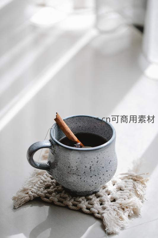 灰釉粗陶杯盛热茶,肉桂枝斜倚杯沿,窗影洒落编织杯垫