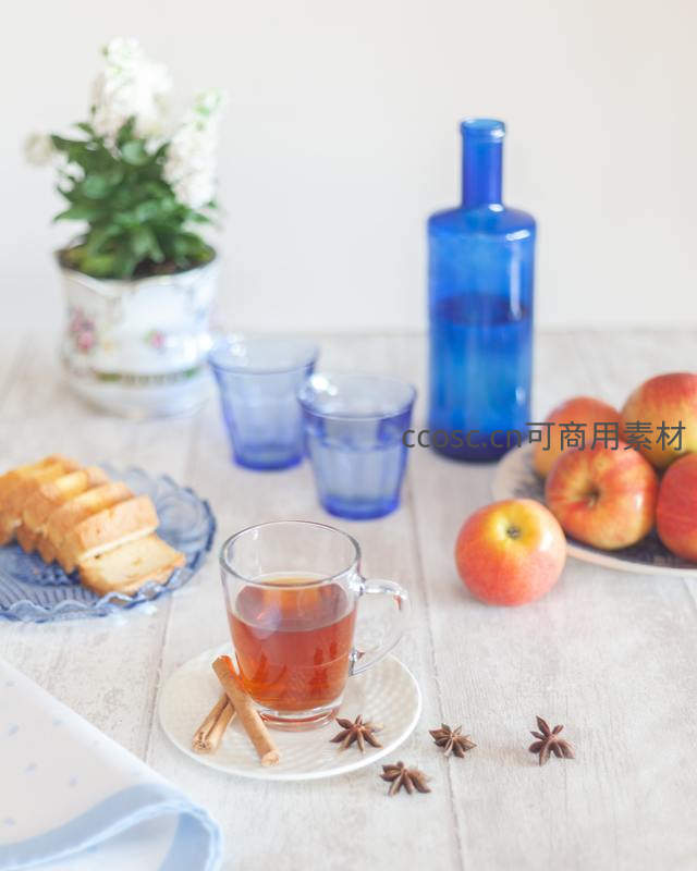清新茶桌布景:玻璃杯红茶配苹果、肉桂与蓝瓶水景致