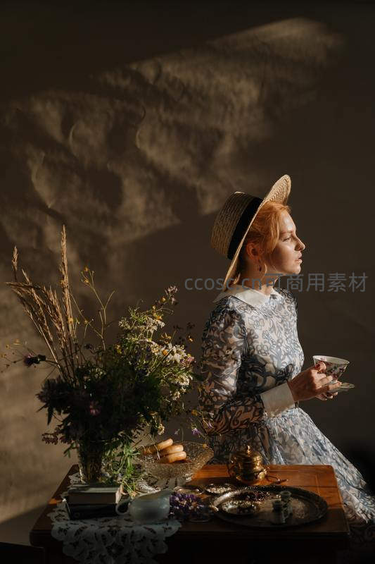 红发女子身着蓝白印花长裙、头戴草帽,端坐于木桌旁手持骨瓷茶杯;桌上野花束、饼干盘与黄铜茶具错落有致,墙面投射出强烈明暗对比的浮雕式光影,营造如油画般的古典浪漫情境。