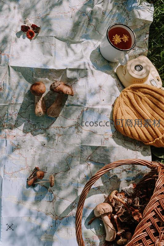 野餐地图上的新鲜采摘蘑菇与花茶静物