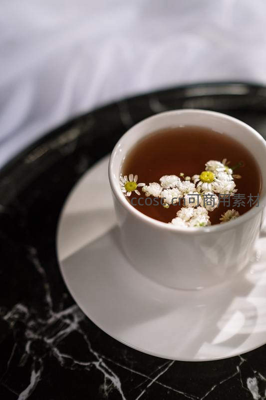 纯白瓷杯盛装琥珀色草本茶,数朵新鲜洋甘菊轻浮于液面,置于黑底白纹大理石托盘之上,背景为朦胧白布,整体呈现高雅宁静的现代茶道美学与疗愈感。