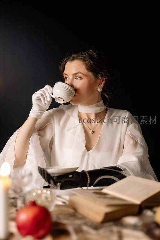 一位身着飘逸白纱衣、佩戴珍珠与白手套的女子正轻啜茶盏,桌上摊开古籍、石榴与烛台,背景深邃,一只黑色机械臂悄然入镜,融合古典优雅与未来科技感。