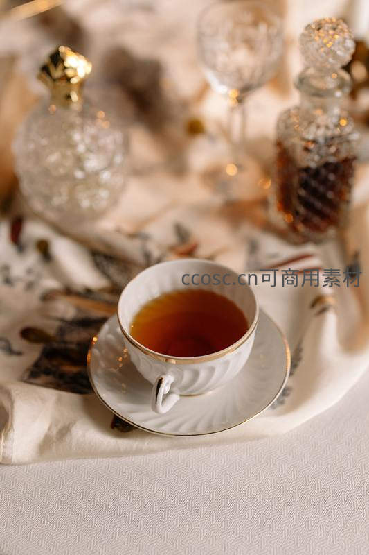 白色金边骨瓷茶杯盛着红茶,置于同款碟上,周围环绕雕花水晶瓶、高脚杯与印花丝巾,柔焦光影营造出20世纪初欧洲贵族沙龙般的温馨怀旧氛围。