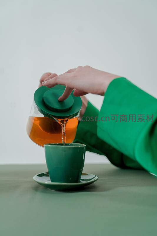 绿袖手 Pouring 琥珀茶汤入青瓷杯,简约现代茶艺特写