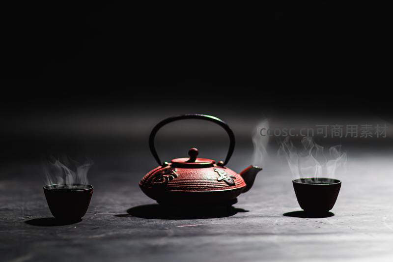 暗调茶艺静物:红漆铁壶与热气升腾的黑釉茶盏