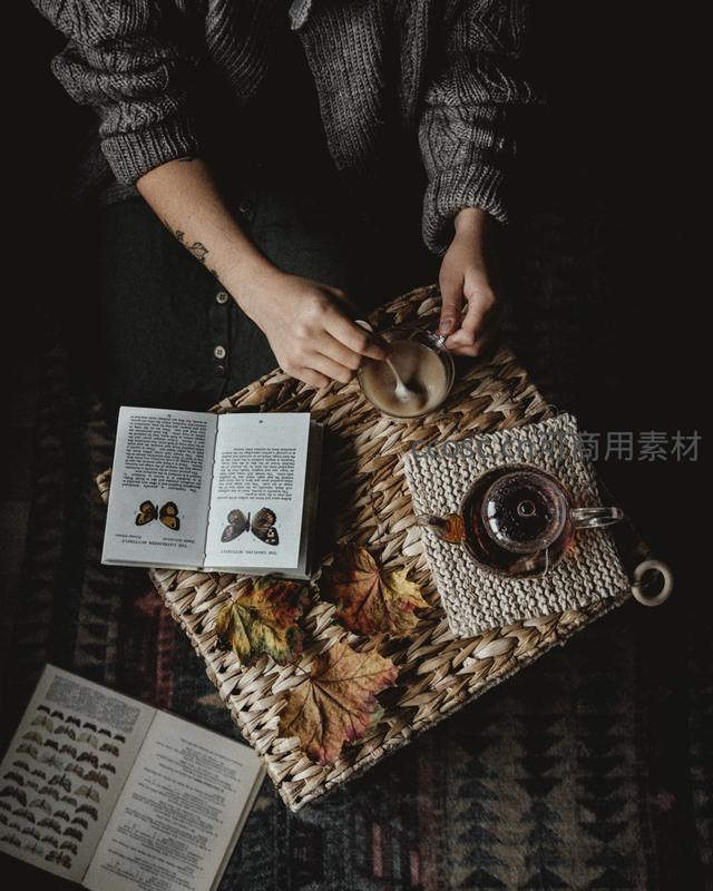 俯拍秋日阅读茶席:藤编托盘上书页、蝶图鉴、红茶与落叶交织