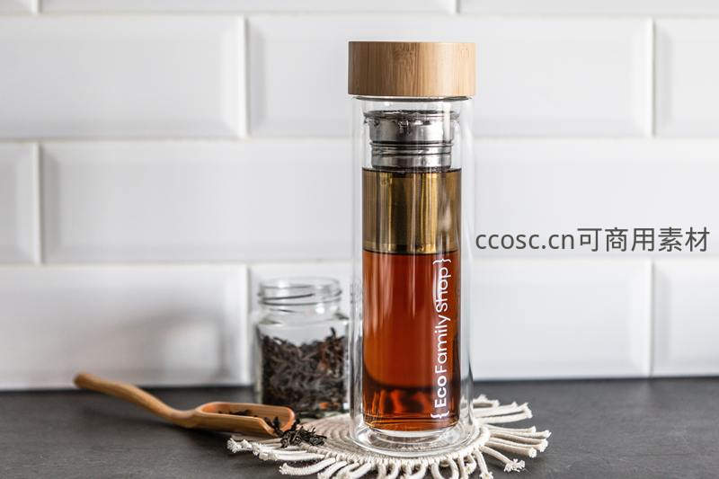 双层玻璃茶瓶装冷泡茶,竹盖与干茶叶点缀现代简约茶具