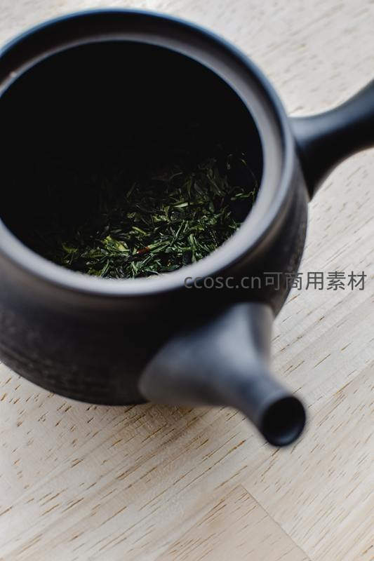 黑陶茶壶俯视视角,内盛翠绿茶叶置于浅木纹桌面
