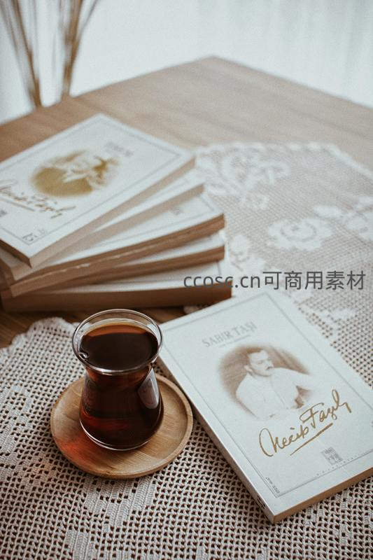蕾丝桌布上的土耳其茶与文学书籍,书香茶韵交织静谧阅读时光