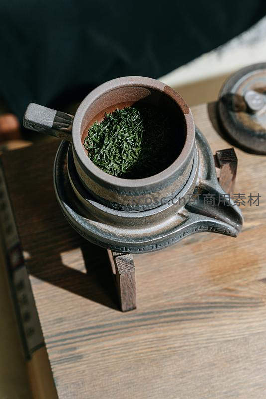 古朴陶壶中盛放新采绿茶,阳光洒落显茶芽鲜嫩翠绿