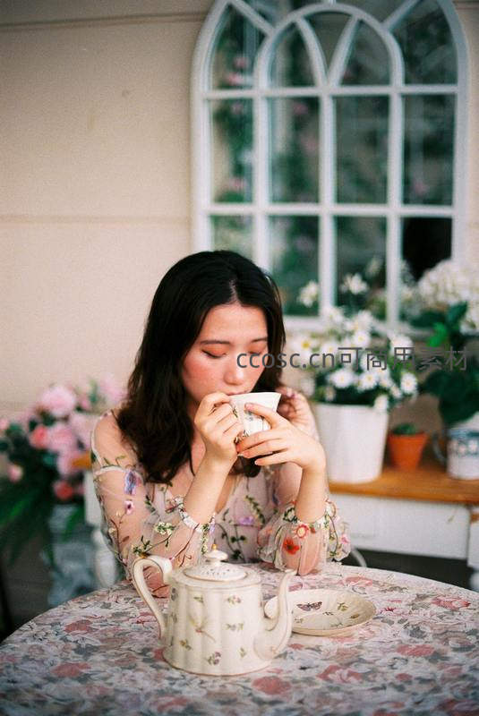 年轻女子身着碎花薄纱衣,双手捧杯轻饮,神情恬静;桌上摆放蝴蝶纹茶壶与碟,背景是拱形窗与白雏菊盆栽,整体色调柔和,充满胶片感的日常诗意瞬间。