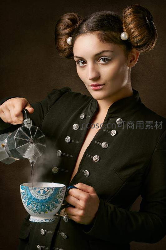 复古双髻女子手持摩卡壶 pour 热茶,蓝白瓷杯蒸汽袅袅