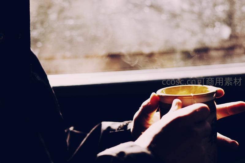 一双温暖的手紧握着冒着热气的陶瓷杯,窗外模糊的冬日光影透过车窗洒入,蒸汽袅袅升腾,营造出宁静治愈的旅途氛围,传递慢节奏生活的诗意与温度。