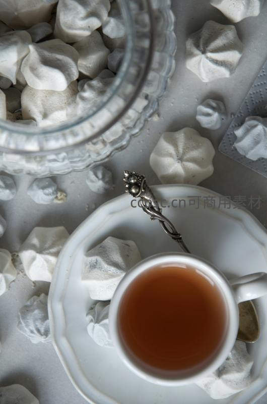 白瓷杯盛红茶配蛋白糖霜马卡龙,俯拍雅致下午茶场景