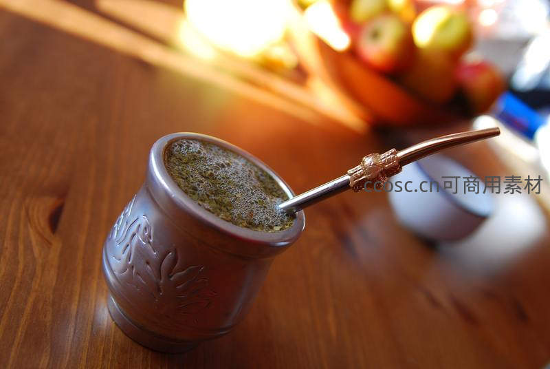 南美马黛茶壶配金属吸管,木质桌面映衬传统饮茶仪式