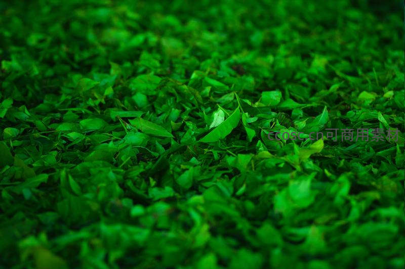新鲜采摘的翠绿茶叶铺满竹匾,微距展现叶脉与露珠细节