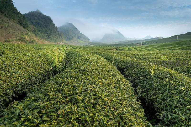 晨雾缭绕的梯田式茶园,绿意盎然,山峦隐现如水墨画卷