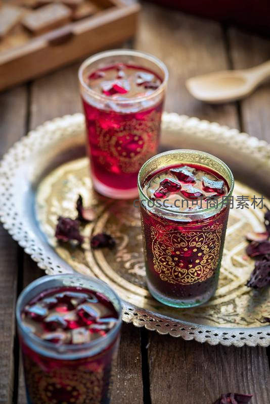 三只饰有金色伊斯兰风格纹样的玻璃杯盛装深红色洛神花茶,冰块浮于表面,散落干花与铜质雕花托盘相映成趣,营造出浓郁中东风情的悠闲饮茶场景。