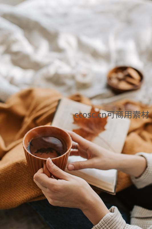 一双女性手轻握棕色竖纹陶杯,杯中热饮氤氲;身披暖橘色针织毯,膝上摊开书页夹着枫叶,背景柔软白被,整体色调温暖治愈,诠释秋日慵懒阅读时刻。