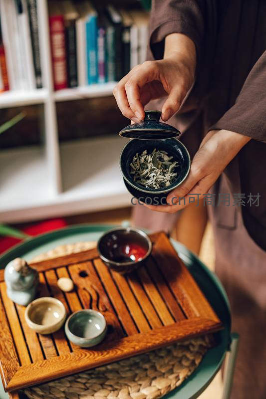 手执黑釉盖碗取茶,茶席布置温馨雅致