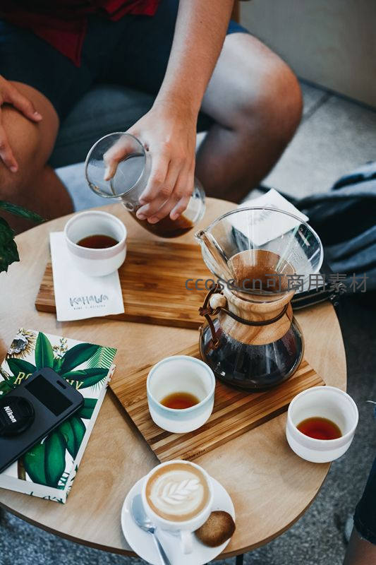 圆形木桌上摆放手冲咖啡器具:玻璃滤杯盛满深褐咖啡液,三只白瓷杯中两杯已斟满,一杯饰有精美叶形拉花;旁置热带植物图案杂志与尼康相机,人物正倾倒咖啡,呈现轻松惬意的都市慢生活片段。