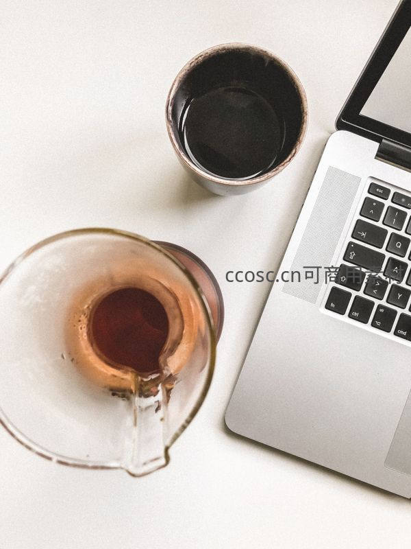 纯白桌面上,玻璃手冲壶正滴滤深褐色咖啡液,旁置黑色粗陶杯与银色MacBook;构图干净利落,强调专注与效率,传递自由职业者或创意工作者的日常节奏。