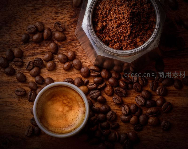 摩卡壶与意式浓缩咖啡豆的复古木桌特写