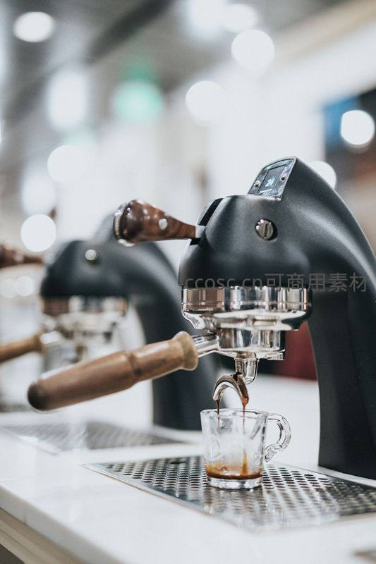 专业意式咖啡机萃取浓缩咖啡液,金属质感与木质手柄相映成趣