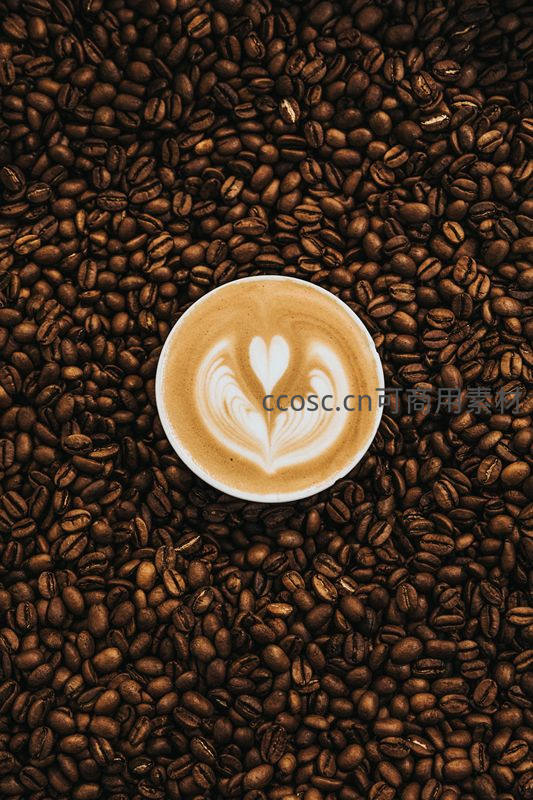 心形拉花艺术咖啡置于深烘咖啡豆海中,俯拍构图展现视觉美感
