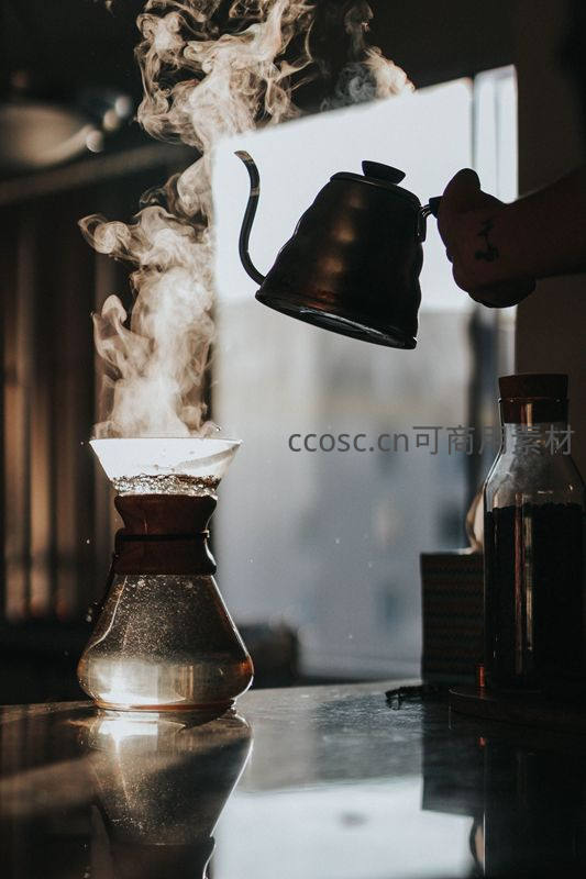 蒸汽升腾中手冲咖啡:铜壶注水瞬间与玻璃滤壶光影交织