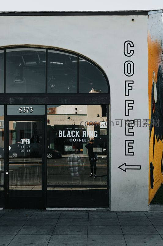 白色外墙垂直排列‘COFFEE’粗体字母并配箭头指引,左侧拱形玻璃窗内可见‘BLACK RING COFFEE’招牌与营业时间,右侧橙黄墙面绘有抽象涂鸦,整体呈现兼具工业风与艺术感的城市咖啡文化空间。