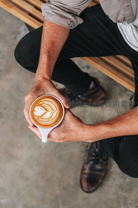 从上方俯视角度拍摄,一双带有雀斑的手稳稳托住白色陶瓷杯,杯中奶泡拉出清晰叶形图案;人物身着休闲装坐于木条长椅上,地面为水泥质感,整体画面宁静自然,传递慢节奏咖啡生活的温度与专注。