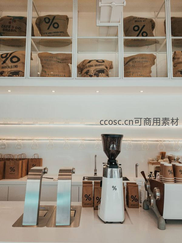 洁净明亮的咖啡吧台区域,中央立式白色磨豆机印有品牌标识,后方玻璃柜内整齐陈列印有“%”标志的咖啡生豆麻袋,标注产地如巴西、埃塞俄比亚等;背景灯带与悬挂杯架营造专业又温馨的消费环境,体现品牌调性与透明溯源理念。