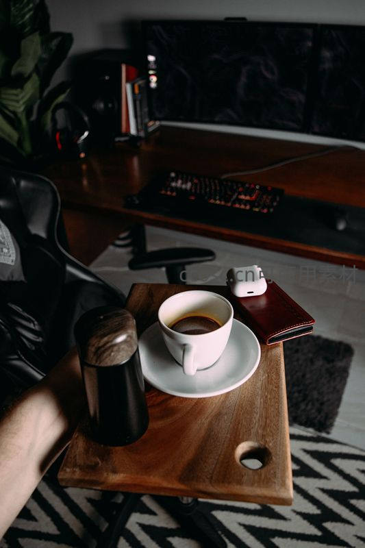 办公桌旁手冲咖啡时光:白瓷杯、木托盘与电竞设备的现代工作场景