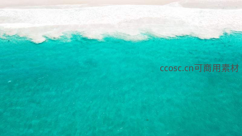 从高空俯瞰,碧绿清澈的海水与洁白细腻的沙滩交相辉映,浪花轻柔拍岸,宛如人间仙境。