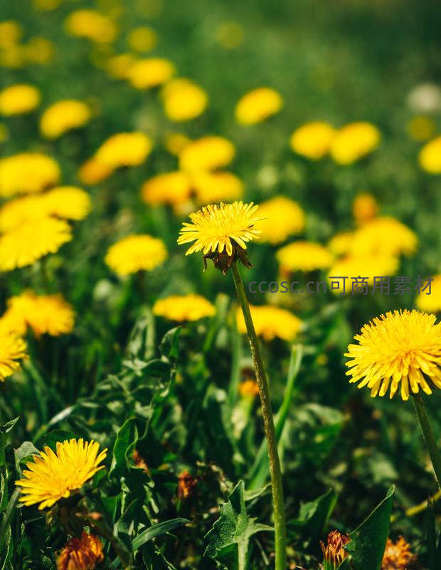 一片广阔的绿色草地上,无数金黄色的蒲公英竞相开放,在阳光下显得格外灿烂,充满了春天的活力与希望。