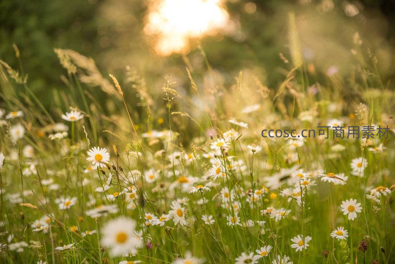 温暖的夕阳光线穿透草丛,为整片雏菊花海披上金色薄纱,花朵在柔和光晕中轻轻摇摆,营造出如梦似幻、宁静祥和的黄昏美景。