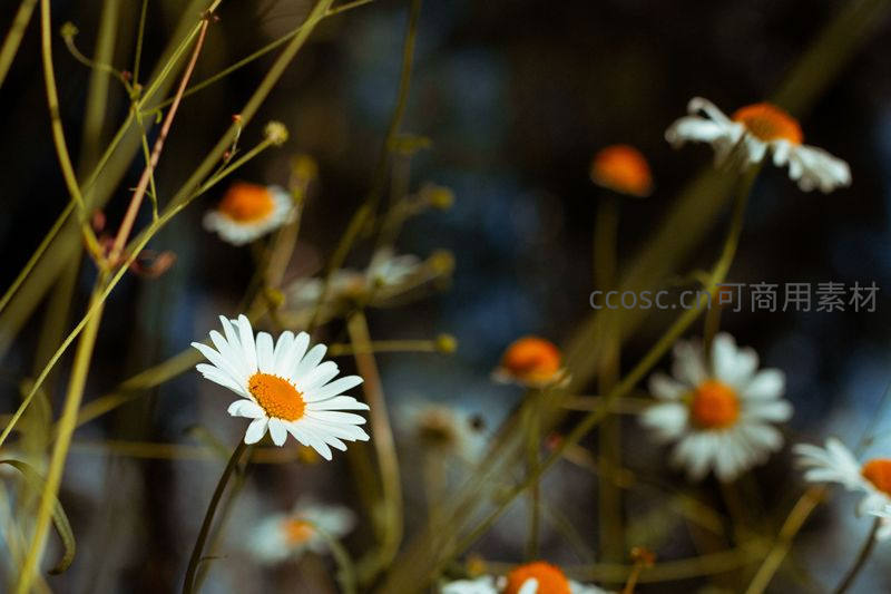暗影中的雏菊,橙黄花心在幽暗背景下熠熠生辉