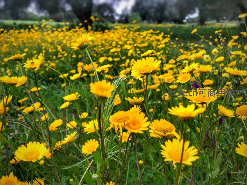 一片金黄色的雏菊在翠绿的田野中竞相开放,充满春天的活力与自然的宁静。