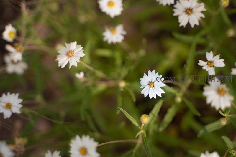 几朵洁白的小雏菊在模糊的绿色背景中静静绽放,展现出自然的纯净与温柔。