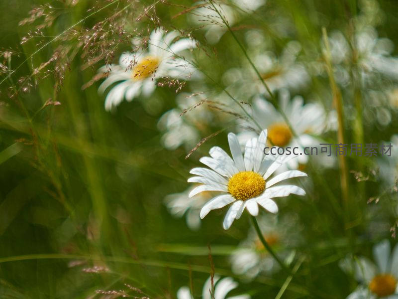 一朵洁白的雏菊在随风飘动的青草丛中优雅绽放,营造出宁静而诗意的田园画面。