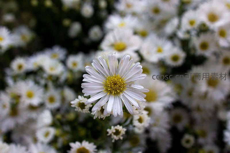 焦点清晰的雏菊在虚化花丛中脱颖而出