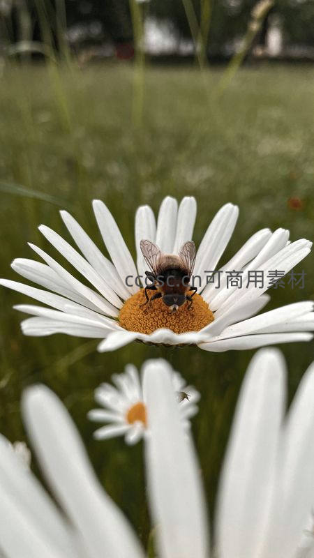 蜜蜂采蜜于雏菊花心之上