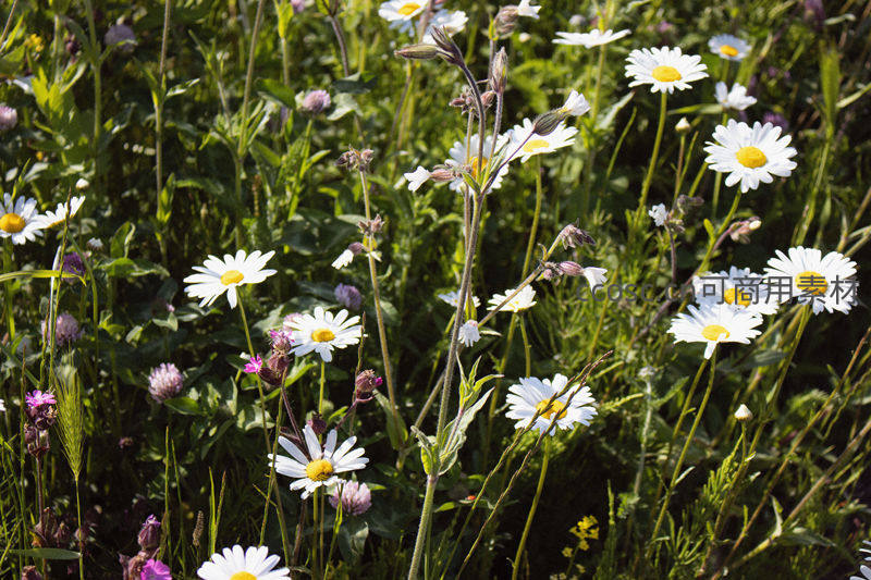 阳光洒满原野,白色雏菊与紫色野花交织成片,在微风中轻轻摇曳,构成一幅生机勃勃的田园画卷。