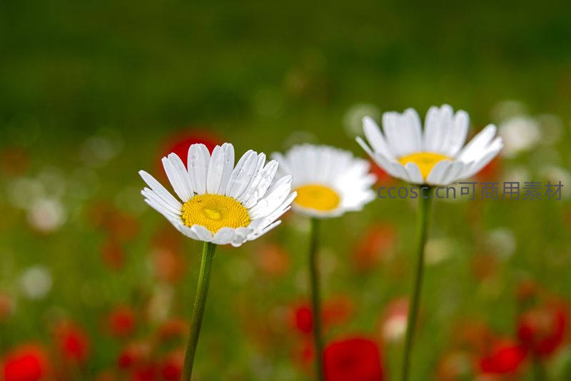 三朵洁白雏菊在前景清晰呈现,身后是模糊的红色花海,色彩层次丰富,凸显了花朵的纯净与活力。