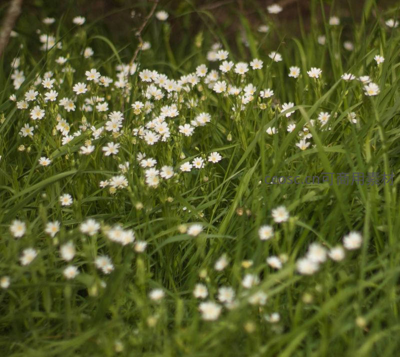 在翠绿的草丛中,无数白色小花竞相开放,展现出大自然的宁静与生机。