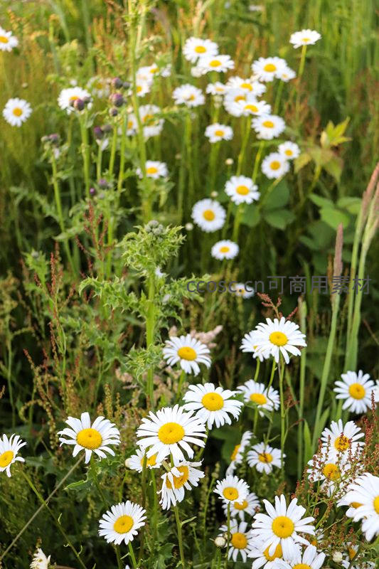 阳光洒落在野花丛中,雏菊与杂草共生共荣,白瓣黄蕊在绿叶衬托下格外醒目,展现出蓬勃向上的自然生命力。
