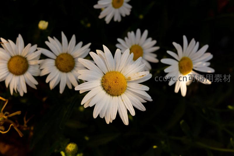 夕阳余晖穿透雏菊花瓣,勾勒出柔和的光晕,展现出花朵细腻的纹理和温暖的质感。