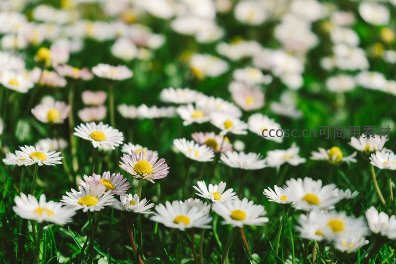 部分雏菊泛着淡雅粉色,与纯白花朵相互映衬,在绿意盎然的背景下构成一幅温柔梦幻的画面。